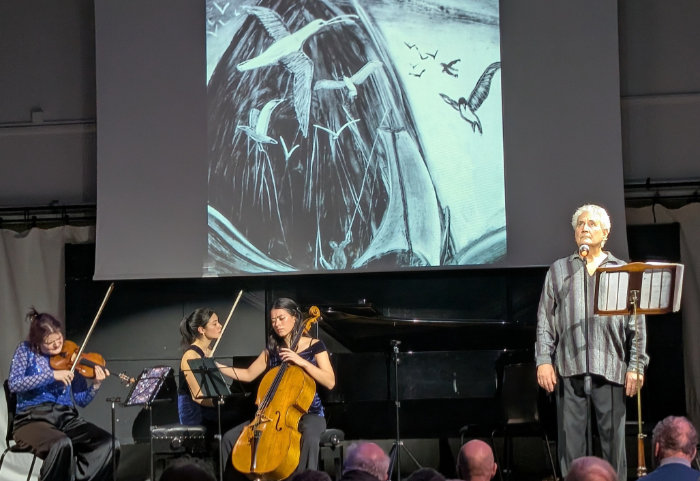 After the interval, Sally Beamish and Peter Thomson introduced Sally's work The Seafarer, an Anglo-Saxon Poem in translation, set for Piano Trio and Speaker, and given an extra dimension by images created by Jila Peacock, projected on a screen behind the performers.